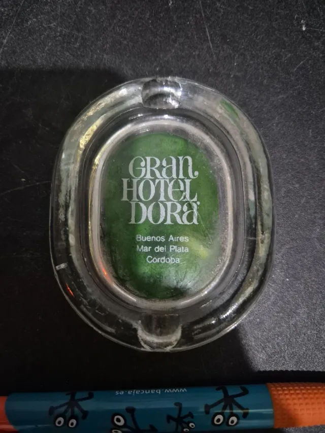 Detalles del productoCenicero de cristal con el logo del Gran Hotel Dora. Un objeto decorativo con un diseño clásico.