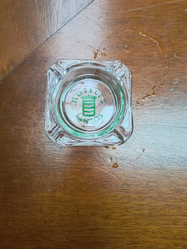 Cenicero de cristal con el logo del Hotel Los Santos. - Diseño cuadrado con muescas para cigarrillos. - Logo del hotel en color verde.