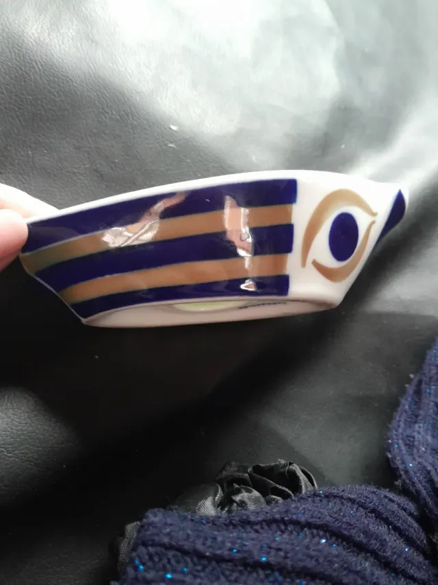 Detalles del productoCenicero de la reconocida marca Sargadelos. Presenta un diseño único con franjas azules y doradas y un detalle de ojo.
