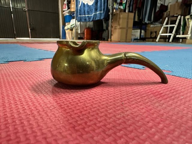 Elegante cenicero vintage fabricado en latón. Su diseño clásico lo convierte en una pieza decorativa. - Material: Latón. - Diseño con asa y pico.