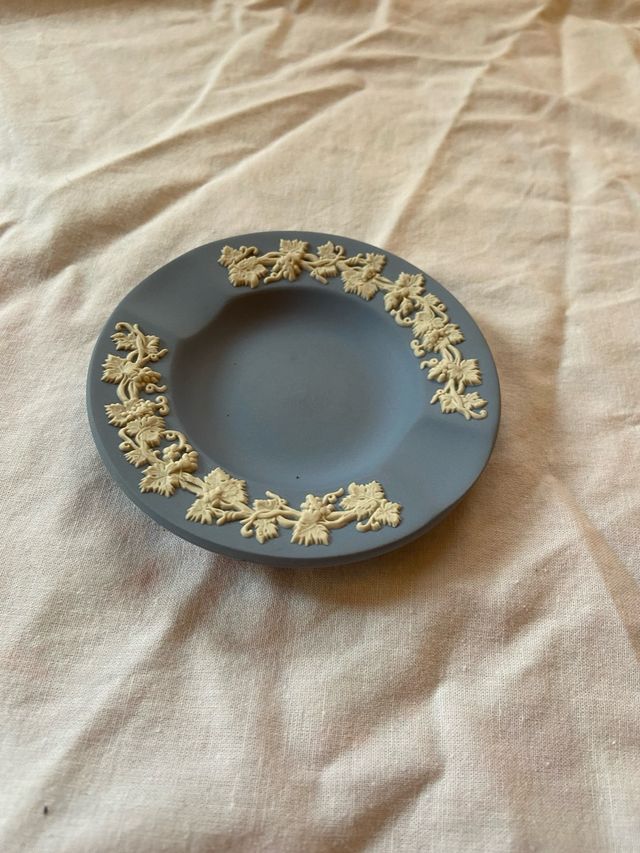 Detalles del productoElegante cenicero de la marca Wedgwood en un tono azul distintivo. Presenta una delicada decoración en relieve con motivos florales y de hojas.