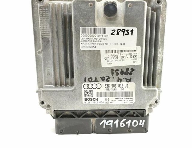 Referencia 0281012654. AUDI A4 AVANT (8E) 2.0 TDI Año 2004 centralita motor uce. Observaciones 03g906016jd. Código interno 1916104.