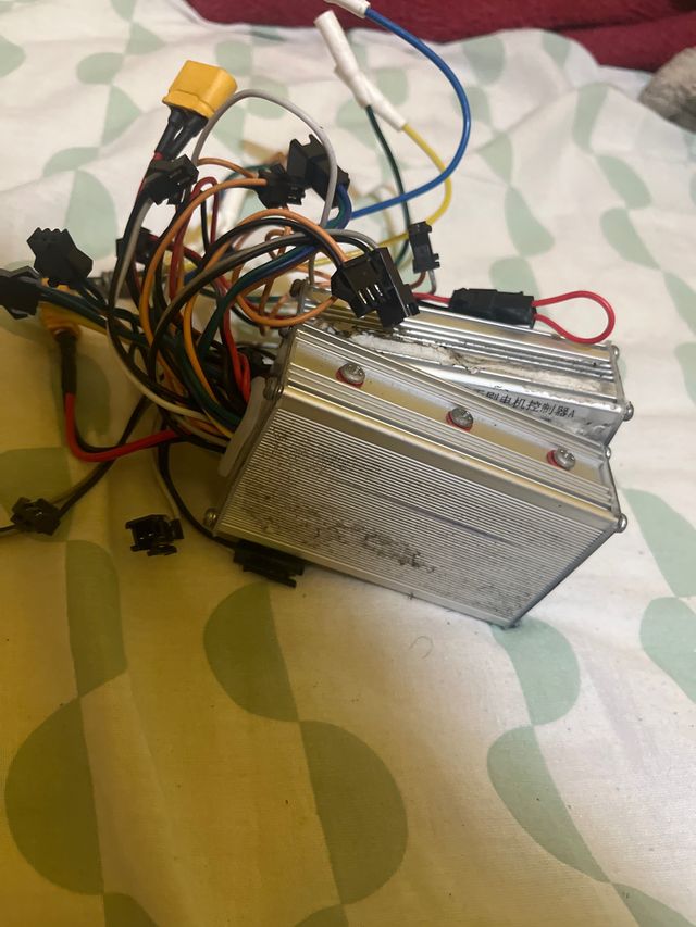 Centralita para patinete eléctrico, con múltiples cables y conectores. - Carcasa metálica plateada. - Incluye varios cables de conexión.
