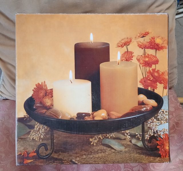 Detalles del productoPlato cerámico sobre pié de hierro con velas perfumadas y piedras, decoración.