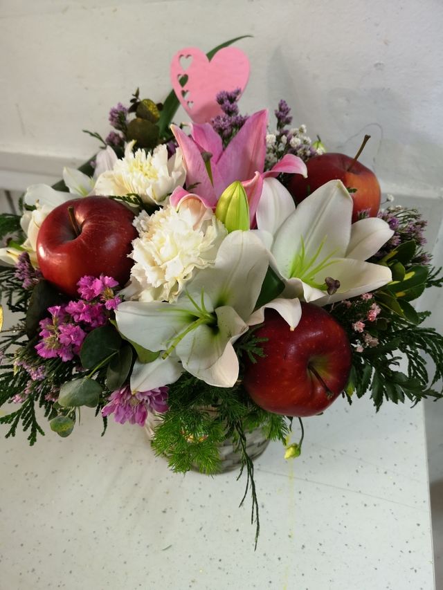 Detalles del productocentro de mesa con 3 o 5 manzanas depende del tamaño precio ,pueden ser flor variada o solo con rosas ,y con su base de mimbre ideal para regalar o para decorar la mesa de comida.. precio desde 40€ recogida en tienda ,gastos de envío no incluidos