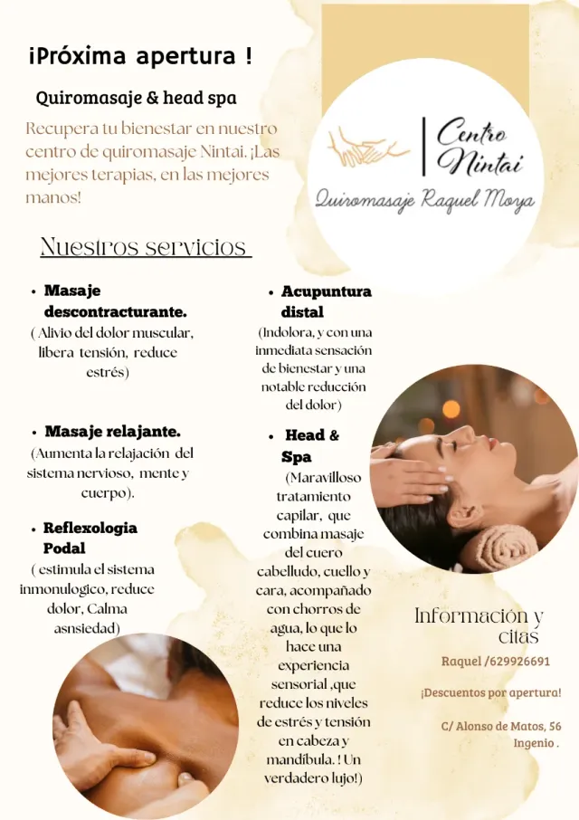 Detalles del producto¿Necesitas recuperar tu bienestar? ¡estás en el sitio adecuado! próxima apertura de nuevo centro de masajes en Ingenio! amplia experiencia profesional!