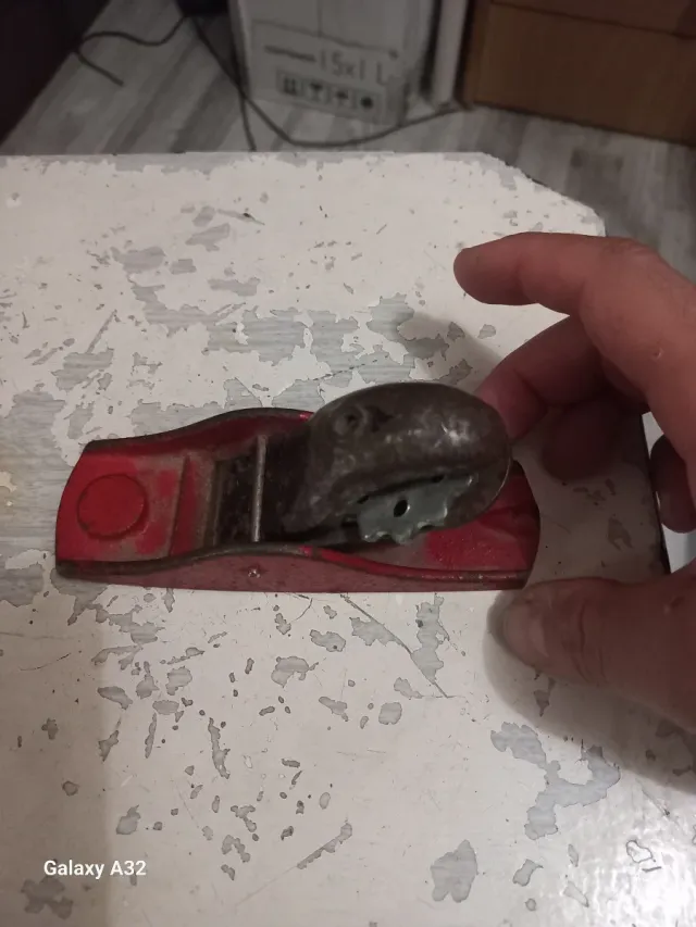 Herramienta de carpintería de color rojo. - Cuerpo metálico. - Mango de metal.