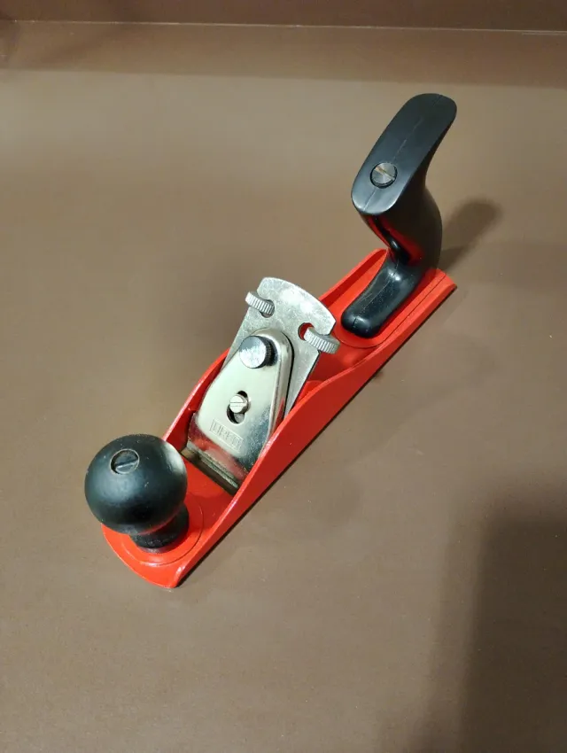 Herramienta de carpintería para trabajar la madera. - Cuerpo de metal rojo. - Empuñadura negra. - Pomo frontal negro.