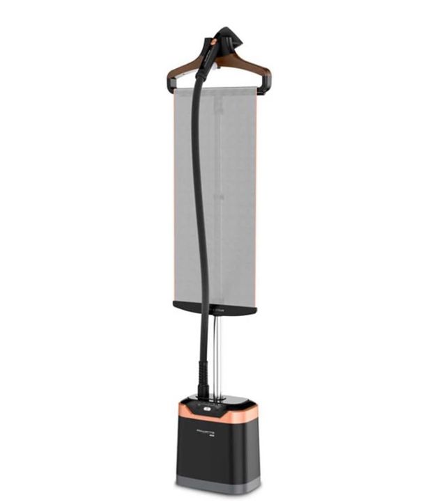 Cepillo de vapor Rowenta para el cuidado de la ropa. - Diseño moderno en negro y cobre. - Incluye percha y soporte. - Manguera flexible para un uso cómodo.