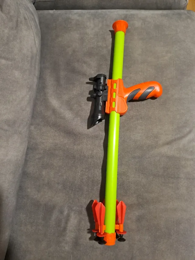 Detalles del productoCerbatana de juguete con un diseño llamativo en color verde y naranja. Incluye un accesorio tipo mira y un soporte para dardos.