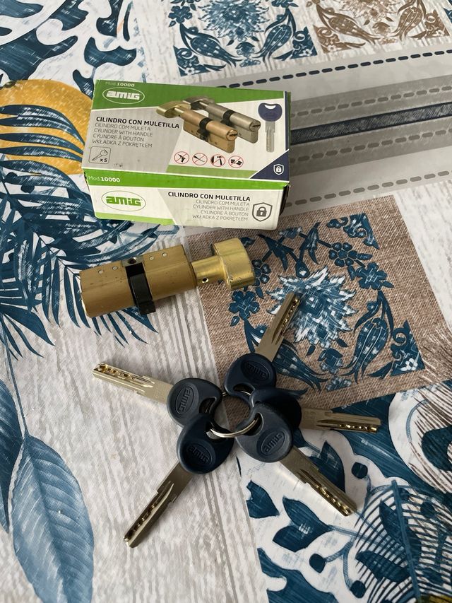 Cerradura de alta seguridad en buen estado. se vende por cambio de cerradura. incluyen 5 copias de llaves e incluye tarjeta. Mide 7cm