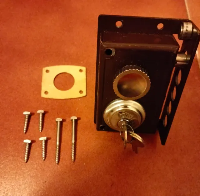 Detalles del productoCerradura de puerta de metal con acabado oscuro, incluye dos llaves y tornillos para su instalación.