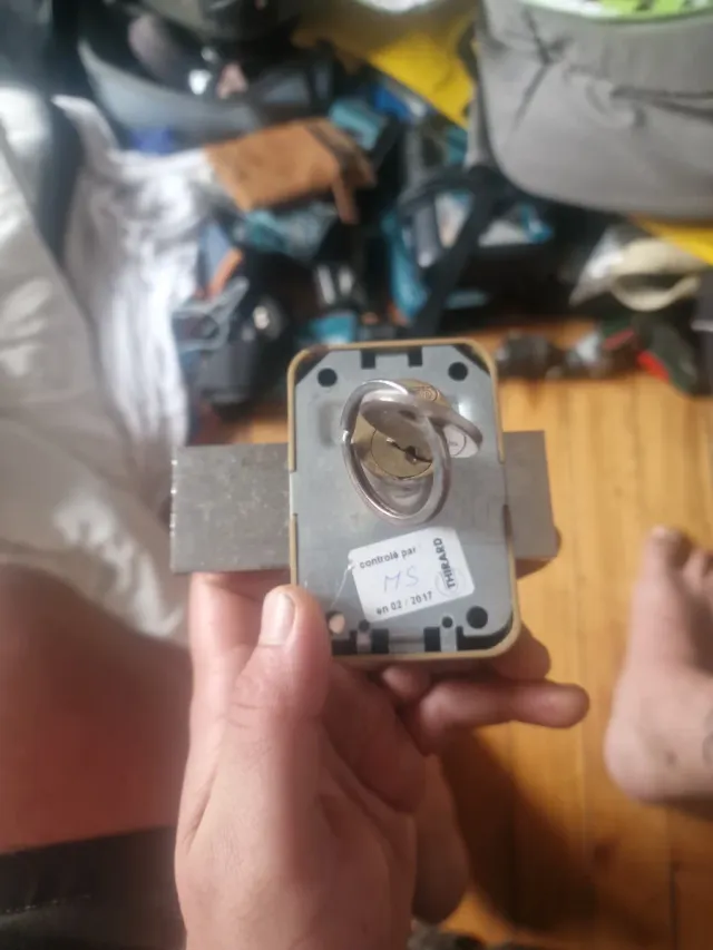 Cerradura de seguridad metálica con llave. - Mecanismo de cierre. - Incluye llave. - Etiqueta de control con fecha '02/2017'.