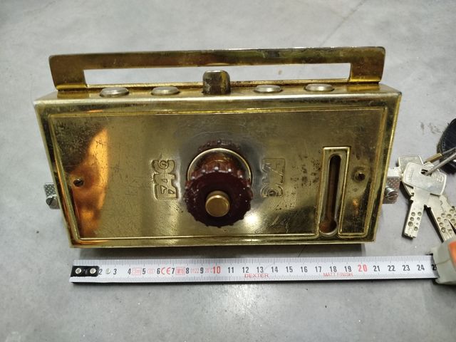 Detalles del productoCerradura de seguridad multipunto de latón con acabado dorado. Incluye el pomo y la ranura para la llave. Con 4 copias de llave.