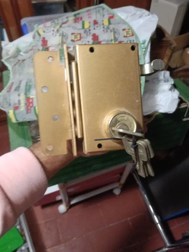 Detalles del productoCerradura de seguridad para puerta de entrada, con acabado en color dorado.No se ha usado guardado sin caja