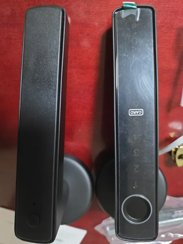Cerradura inteligente de diseño moderno en color negro. - Panel táctil con números. - Lector de huellas dactilares. - Ranura para tarjeta. - Acabado mate.