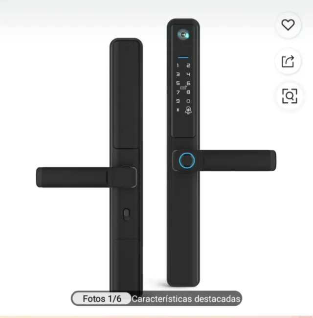 Cerradura inteligente de diseño moderno en color negro. - Panel táctil con teclado numérico. - Lector de huellas dactilares. - Cámara integrada. - Tirador ergonómico.