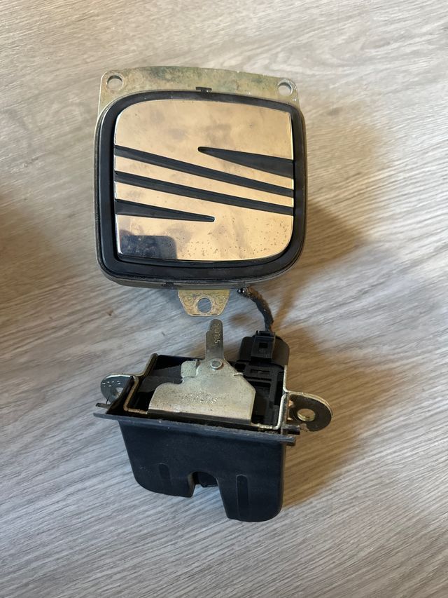 Cerradura y tirador del portón trasero de un Seat. - Diseño con logo de Seat. - Mecanismo de cierre y cableado.