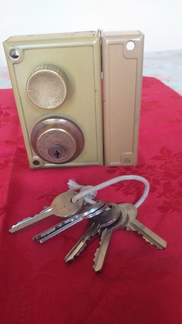 Detalles del productoCerradura de seguridad JIS con acabado en color beige y detalles en bronce. Incluye un juego de llaves.