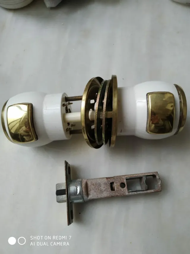 Detalles del productoConjunto de manillas para puerta con acabado blanco y detalles dorados, junto con su cerrojo.