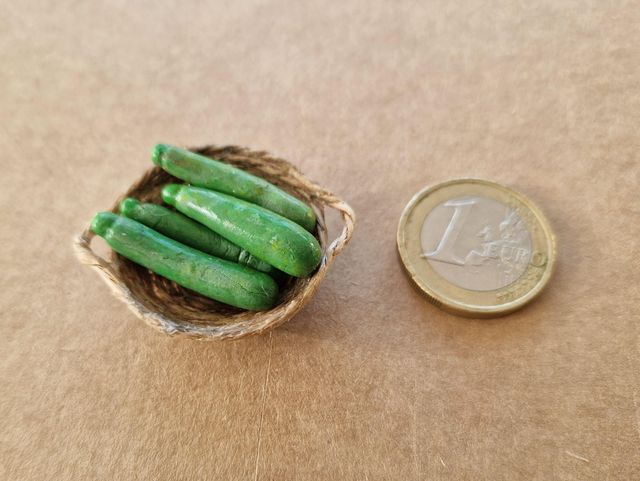 Detalles del productoConjunto de cuatro calabacines en miniatura presentados en una cesta.