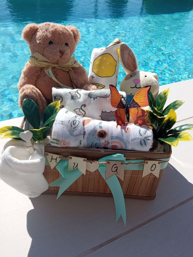 Detalles del productocesta para bautizos, babyshower, aniversarios.... totalmente personalizadas, con colores, muñecos y temática...