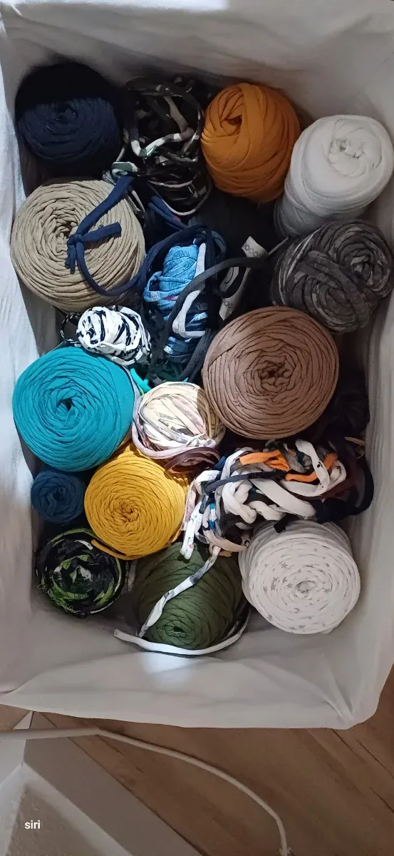 Detalles del productoCesta llena de madejas de trapillo de diferentes colores y texturas.