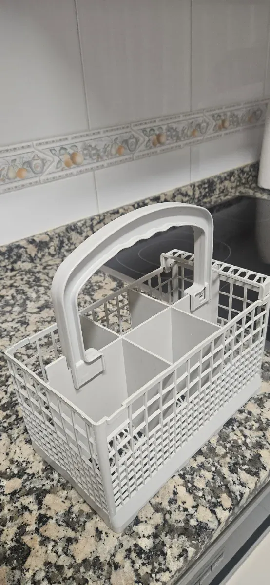 Cesta para cubiertos de lavavajillas con compartimentos. Es de lavavajillas BALAY - Color gris. - Asa para facilitar el transporte. - Diseño con rejilla.