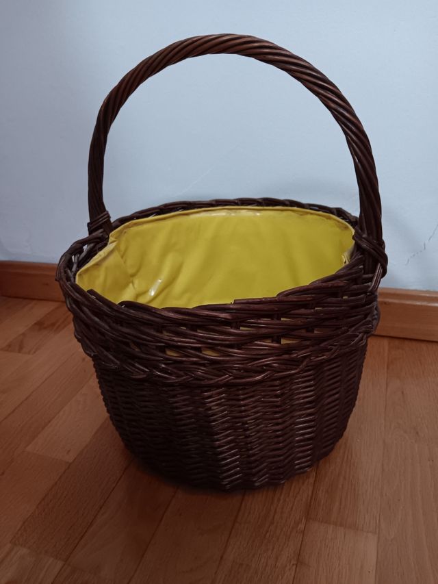 Detalles del productoCesta de mimbre con forro. Es muy resistente. Ideal para fruta y verduras. El forro está un poco manchado. Medidas 23cm de alto (sin contar el asa) x 28cm de diámetro superior. No hago envíos