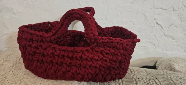 Cesta artesanal de trapillo, perfecta para organizar o decorar. - Material: Trapillo. - Color: Burdeos. - Diseño: Cesta con asas. - Hecha a mano.