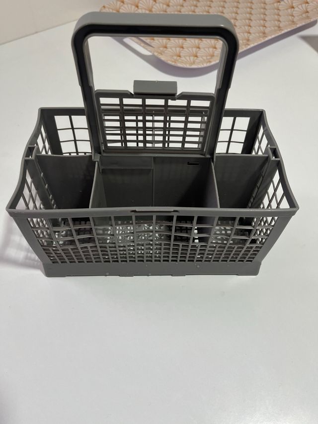 Detalles del productoCestillo gris para lavavajillas, con asa abatible y compartimentos interiores.