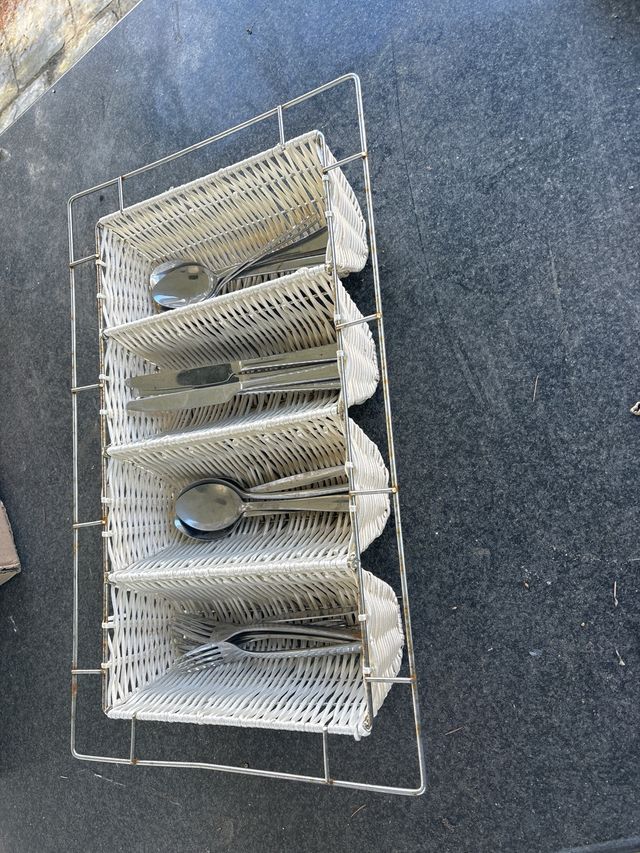 Detalles del productocesta para cubiertos en mimbre y acero , 4 compartimentos . tengo varias unidades. Medidas del producto