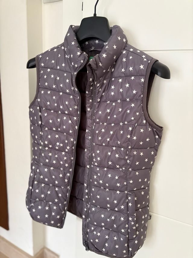Chaleco acolchado para niña con un divertido estampado de estrellas. - Color gris. - Estampado de estrellas blancas. - Cuello alto.