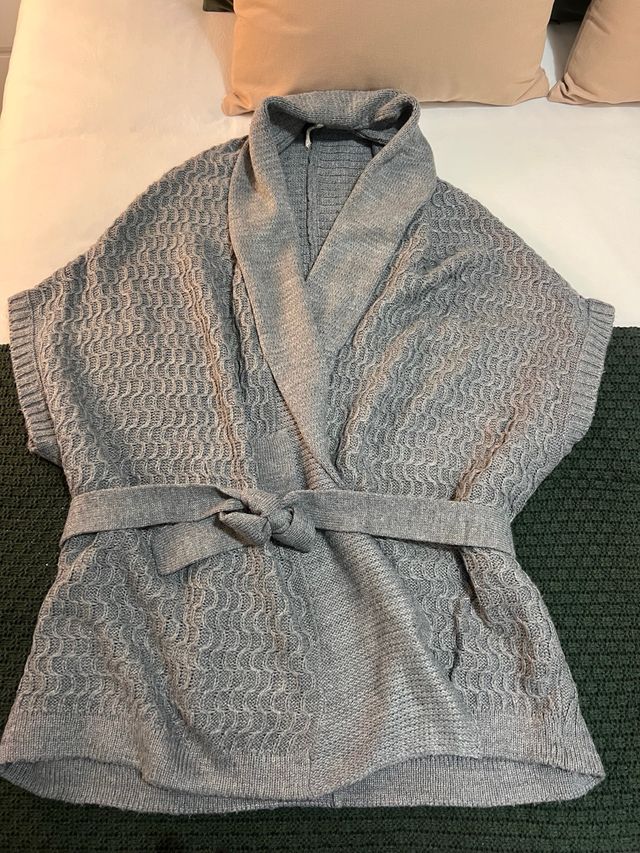 Chaleco de punto gris con un diseño texturizado y un cinturón para anudar.