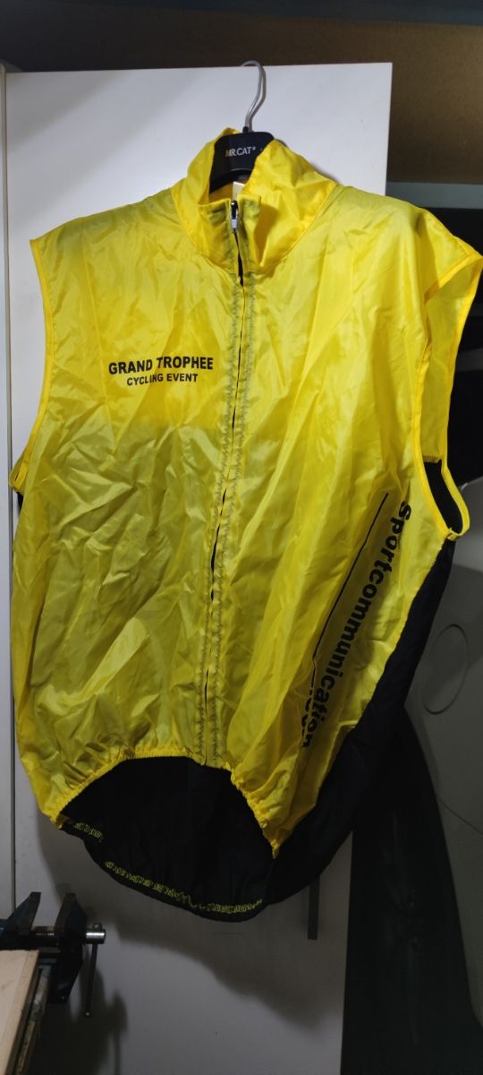 Chaleco muy lijero se pliega en poco volumen, parte trasera con rejilla y la delantera plástica para el viento la talla pone L pero viene a ser XL nunca se ha usado