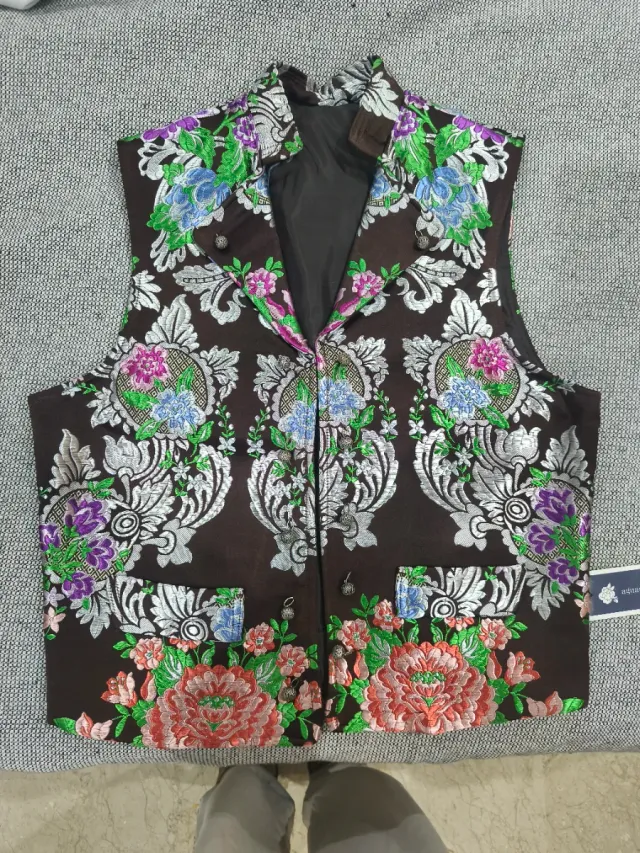 Detalles del productoElegante chaleco con un intrincado diseño floral bordado sobre un fondo marrón.