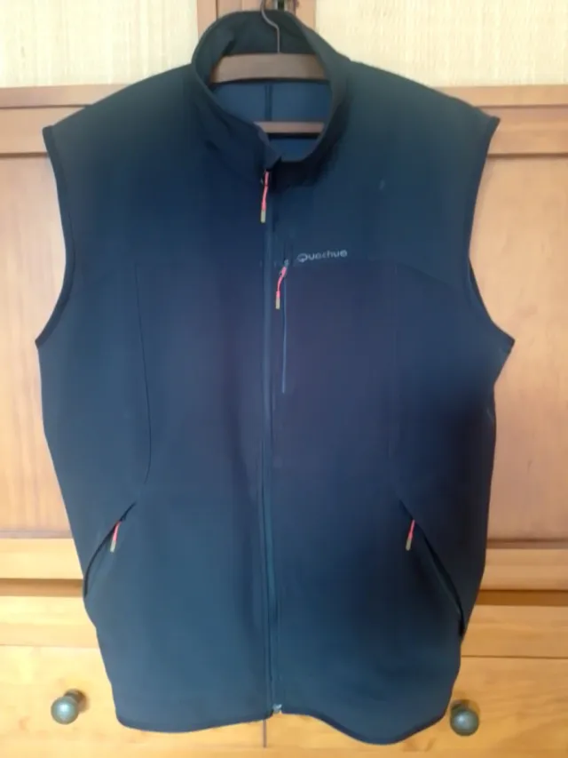 Chaleco cortavientos de la marca Quechua. - Color negro. - Cierre de cremallera. - Bolsillos laterales y frontal con cremallera.