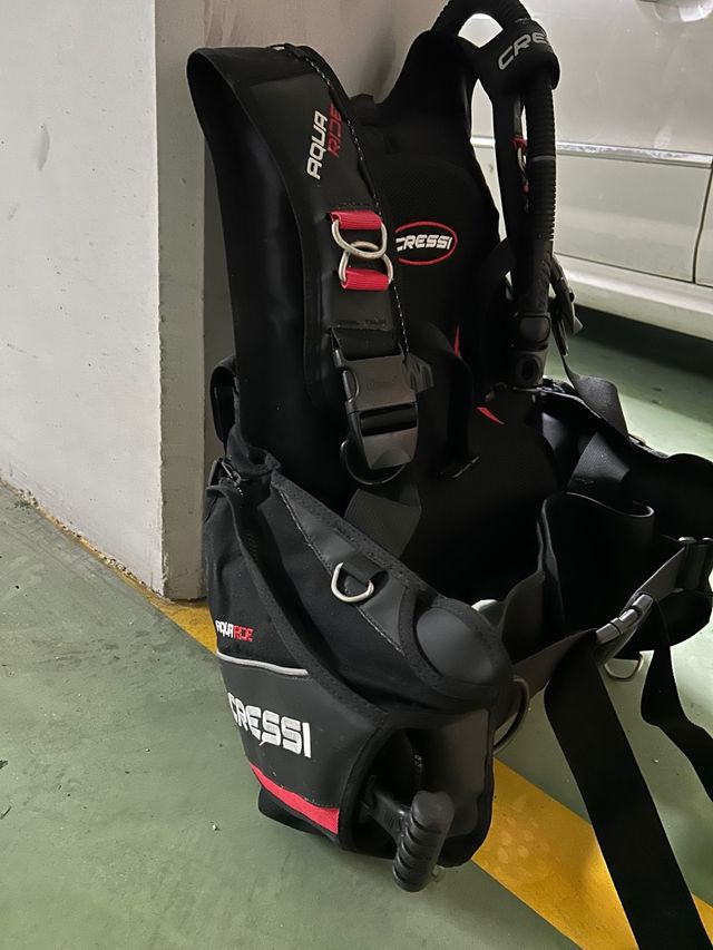 Chaleco de buceo Cressi Aquaride en talla M. Ha tenido poco uso. - Color negro con detalles en rojo. - Cierres y hebillas Cressi.