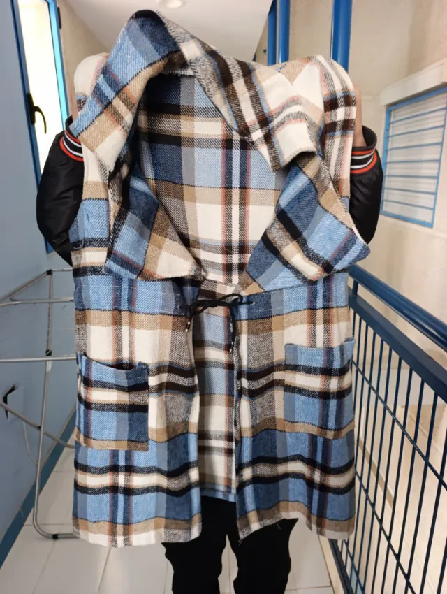 Chaleco de mujer con un diseño a cuadros llamativo. Es una prenda versátil y con estilo.
