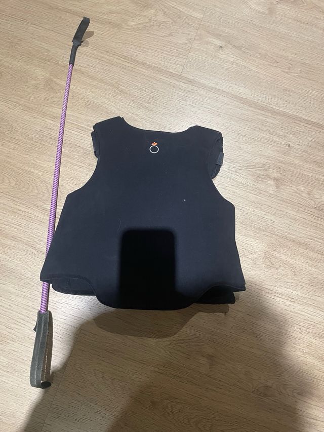 Chaleco de hípica en color negro. Incluye un regalo de polaina y fusta. - Chaleco de protección talla 9/10. - casco talla 56 - Polaina. - Fusta, está la goma separada