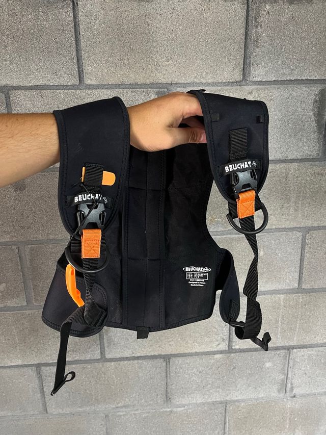 Chaleco de pesca submarina de la marca Beuchat. - Color negro. - Cierres y detalles en naranja. - Hebillas y anillas de sujeción.