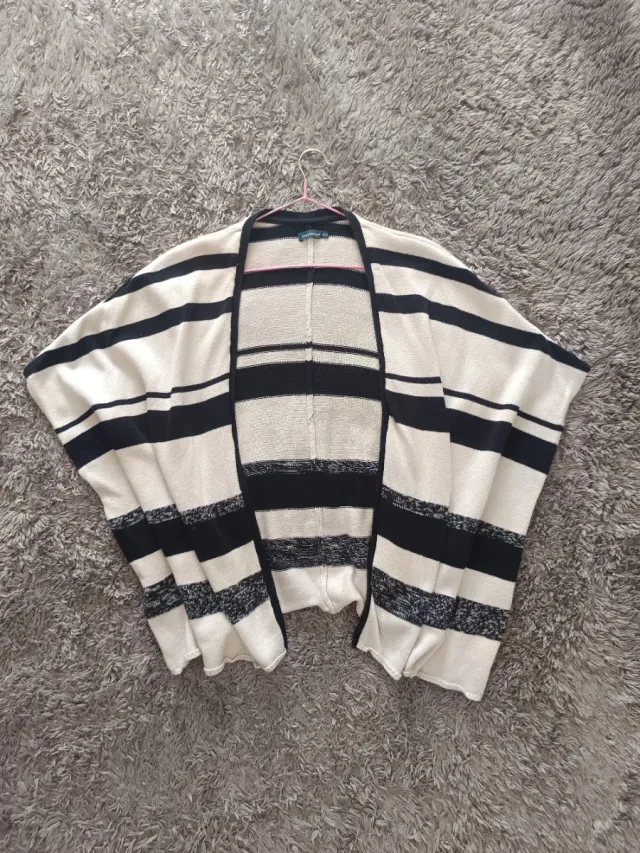 Poncho tipo capa/chaleco de punto en tonos crema y negro con rayas anchas y detalle jaspeado.