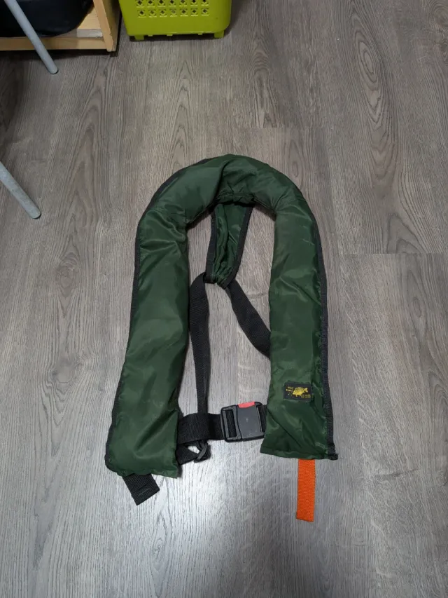 Chaleco salvavidas de CO2, color verde oscuro. Diseñado para flotabilidad. - Cierre de hebilla. - Correa ajustable. - Cinta de sujeción naranja.