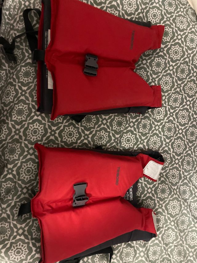 Detalles del productoChaleco salvavidas de la marca TRIBORD, diseñado para niños. Es de color rojo y cuenta con cierres de seguridad.