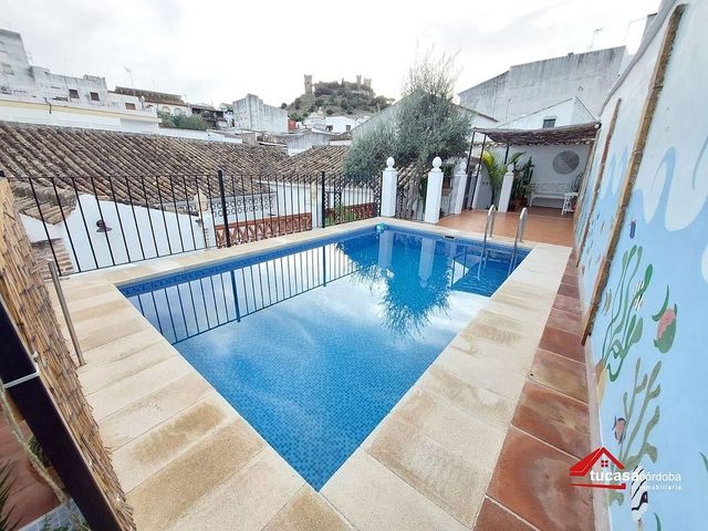 La parte alta de la casa dispone de una piscina privada, rodeada de una terraza solárium con vistas impresionantes al Castillo de Almodóvar del Río, que se alza majestuoso al fondo del paisaje. Esta zona se completa con un aseo exterior, zona de barbacoa, área de descanso y trastero, creando un entorno ideal para el ocio y desconexión.