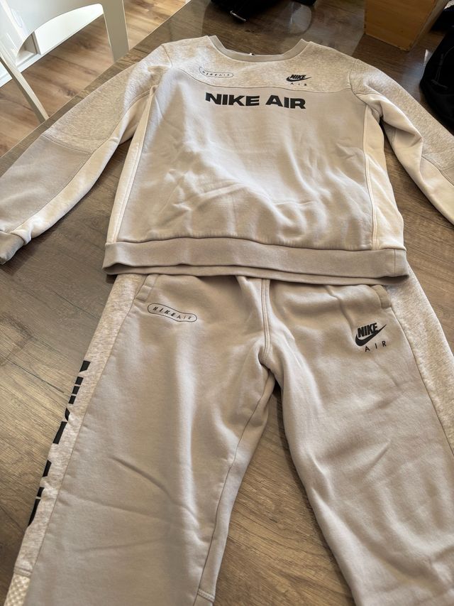 Conjunto de chándal Nike Air en color beige, talla 14. - Sudadera con cuello redondo y logo. - Pantalón con cintura elástica y detalles laterales.