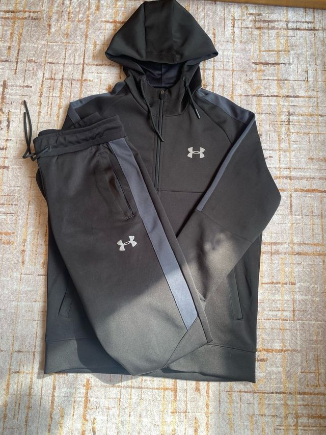 Conjunto de chándal de la marca Under Armour en color negro. - Sudadera con capucha y cremallera. - Pantalón con detalles en gris. - Logo de Under Armour en ambas prendas.