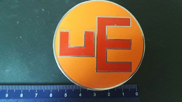 Antigua placa o chapa metálica circular para coche, esmaltada con las letras uE. En color rojo sobre fondo naranja y ribeteado en color plata.