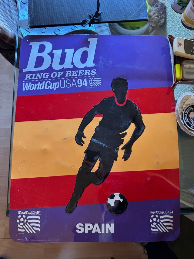 Detalles del productoChapa decorativa de Budweiser conmemorativa del Mundial de Fútbol USA 94, con diseño de España.