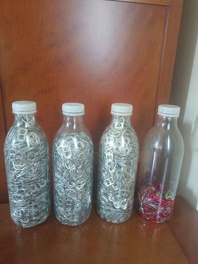Botellas llenas de chapas de latas de refresco. Ideales para manualidades o decoración